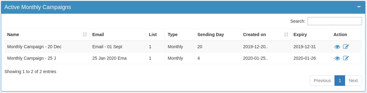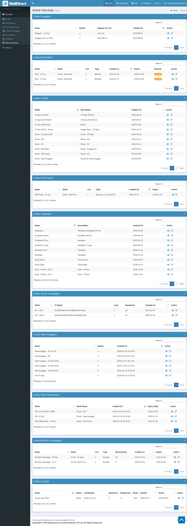- It includes the list of active services like Engagers, Reminders, Emails, RSS Feeds, Templates, Group Campaigns, View Engagers, Click Responders, Monthly Campaigns and Surveys.