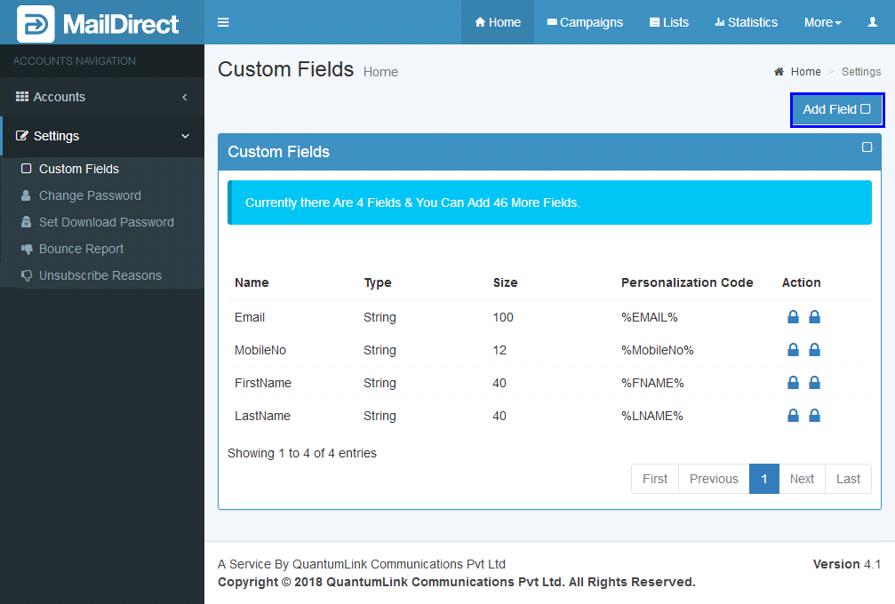 Working with Account ManagerSettingsCustom Field Add Custom Field Link Add Custom Field Link To add Custom Field, users have to click on Add field Button. Figure : Add Custom Field Link