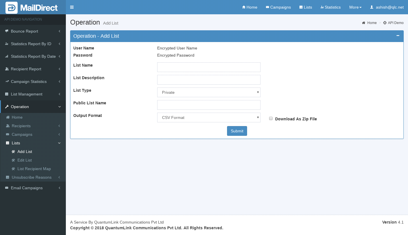 - The Post parameters includes List Name, List Description, List Type and Public List Name