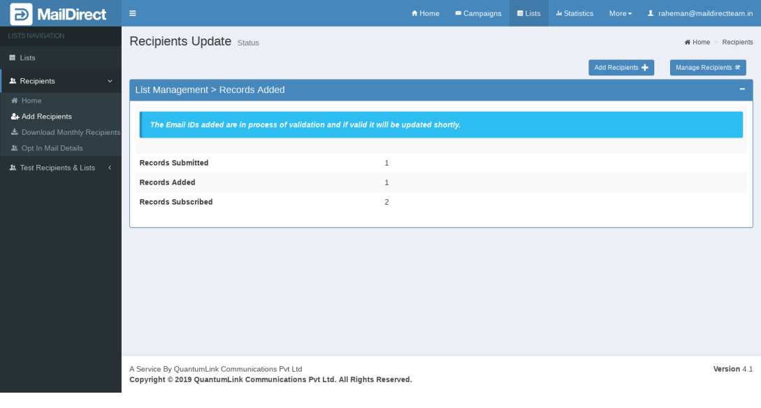 Figure : List Management > Display Recipients Records Added/Subscribed |