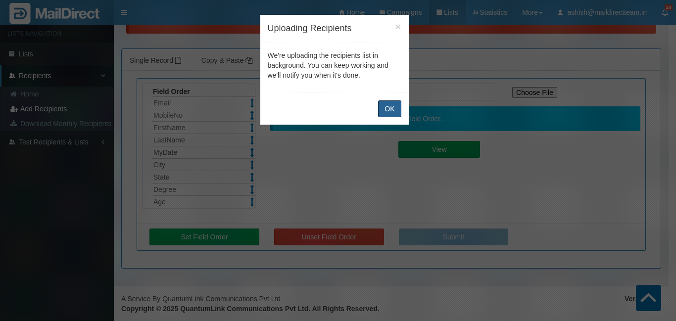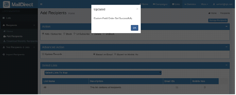 Figure : Unset Custom field order – Successful message Note: The order of the fields in the attached CSV file should be according to the order for the corresponding field name. After clicking the Submit button, MailDirect displays the List Management > Uploading Recipients popup screen.