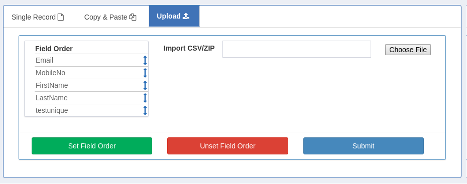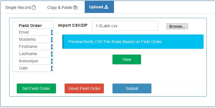 Figure : Recipients Upload Preview – Preview Recipient List. Custom Field Order: The User can set custom field order as well unset Custom field order. This order will be displayed in future. Click on button provided use to set custom field order or unset custom field order.