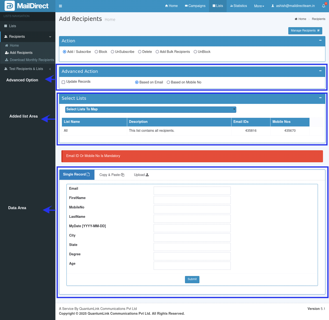 This section provides the tabs and options according to the tab selected for entering the recipient’s data, to add/subscribe recipients to the selected lists. The available tabs are explained below, (A) Single Record: Click this tab to enter the data for a single recipient. If this tab is selected, the options for the Single Record tab will be displayed in the Data Area.