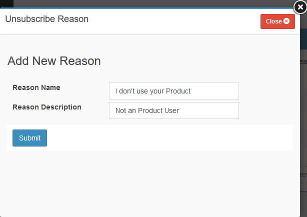 While adding and editing unsubscribe reasons it's to be noted that reason name cannot be the default reasons, the existing custom Reasons and “Other”. The Reason Name cannot exceed 255 characters.