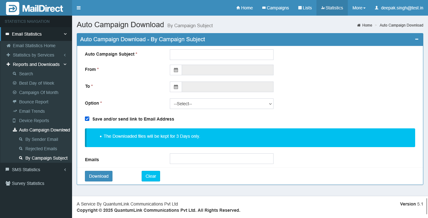 This field provides field to enter campaign subject to download auto campaign how many campaign sent by this subject and its statistics. Enter Complete Valid Campaign Subject. This Field is mandatory |