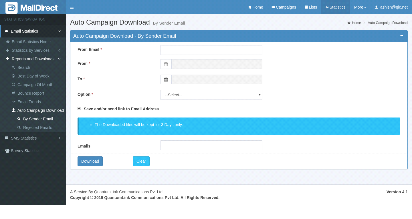This section provides user to download auto campaign details by Sender email between date range. Other parameter includes Option – Send, Delivered, Viewed, Not Viewed, Bounce (Hard and Soft) recipients. Save and/or link to Email Address provides to send email link with download file.