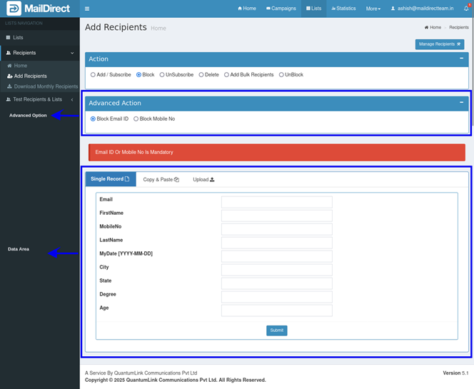 This section provides the tabs and opt ions according to the tab selected for blocking recipients The available tabs are explained below, Single Record: Click this tab to enter the data for a single recipient. If this tab is selected, the options for the Single Record tab will be displayed in the data Area