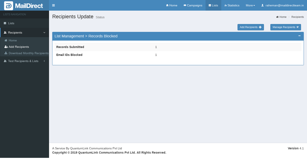 Figure : List Management > Block Recipients Alert Message Note: The recipient uploading process runs in the background, and the user is redirected to the Home page, allowing them to continue working on other tasks without interruption. After the background process is completed, an "Upload Successful" popup is displayed.