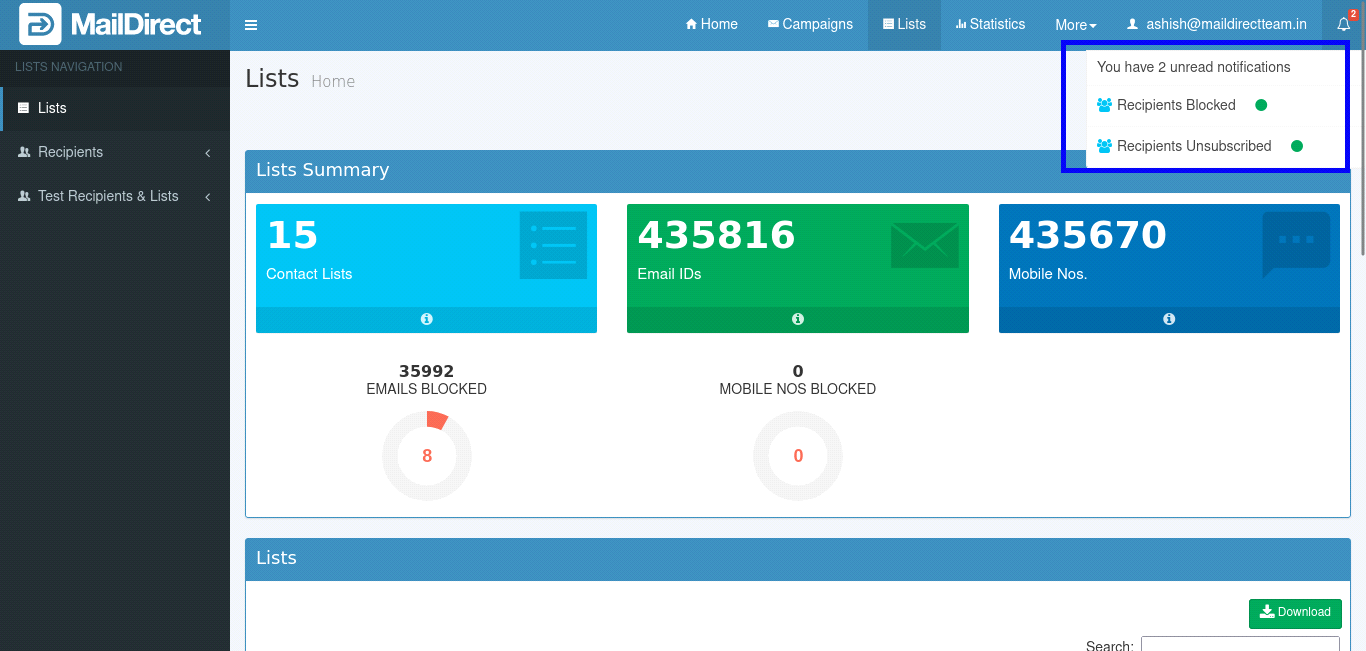Figure : Notification > Block Recipients After clicking the notification link, MailDirect displays the List Management > Records Blocking screen.