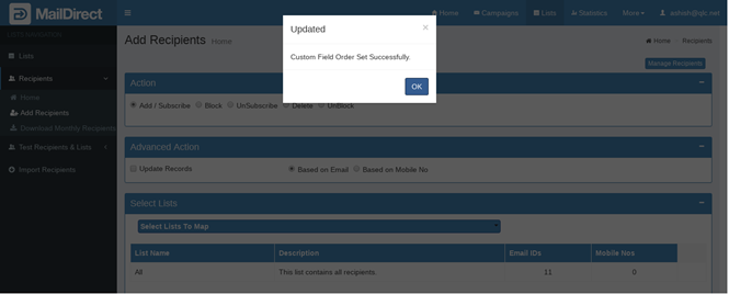 Figure : Unset Custom field order – Successful message Note: The order of the fields in the attached CSV file should be according to the order for the corresponding field name. After clicking the Submit button, MailDirect displays the List Management > Blocking Recipients popup screen.