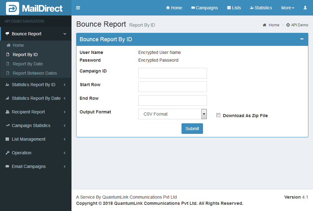 - The API Retrieves the list of Bounce details based on the campaign id.