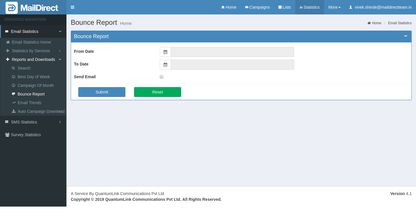 This section provides user to download or send it as an attachment to the a Email the Bounce Details between the selected Date Range.