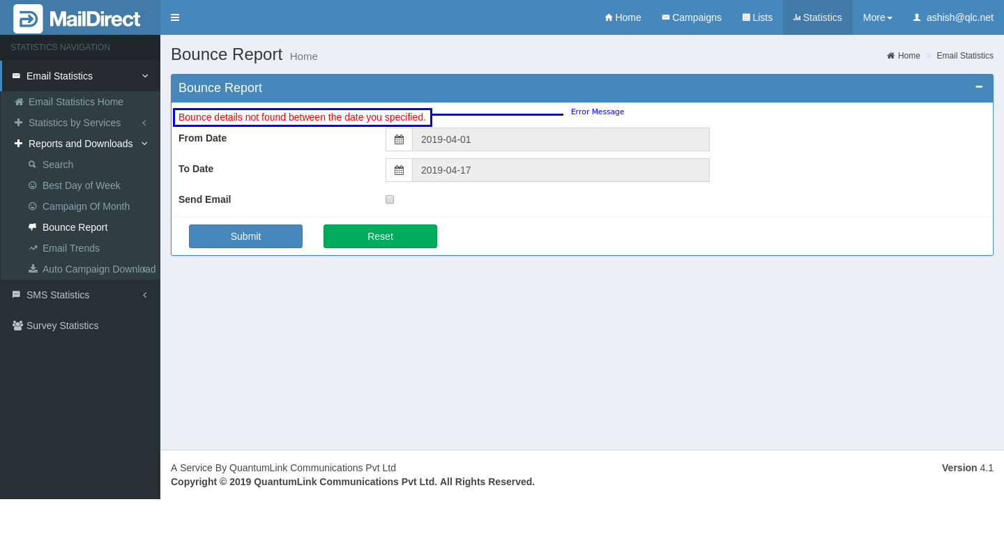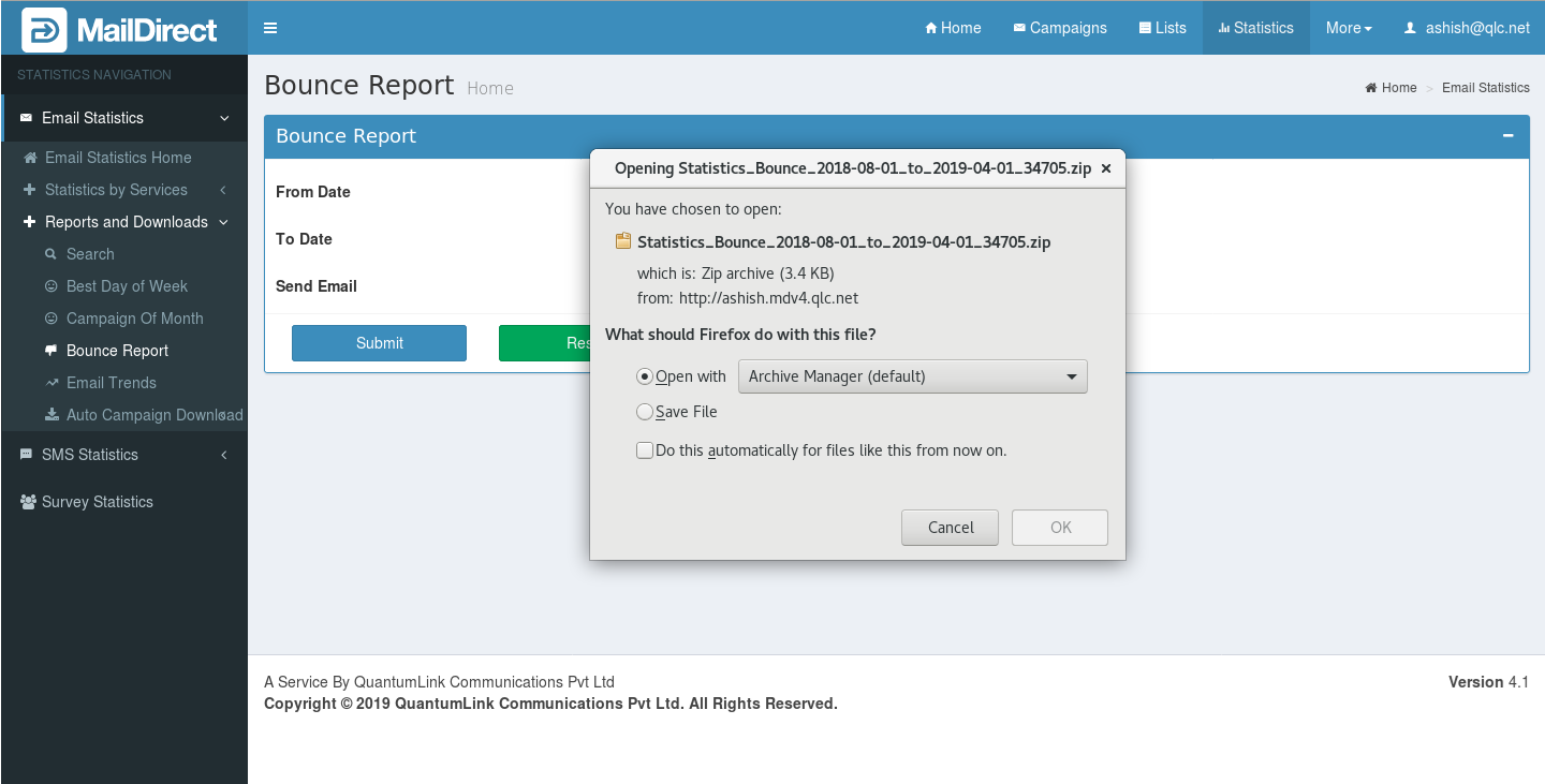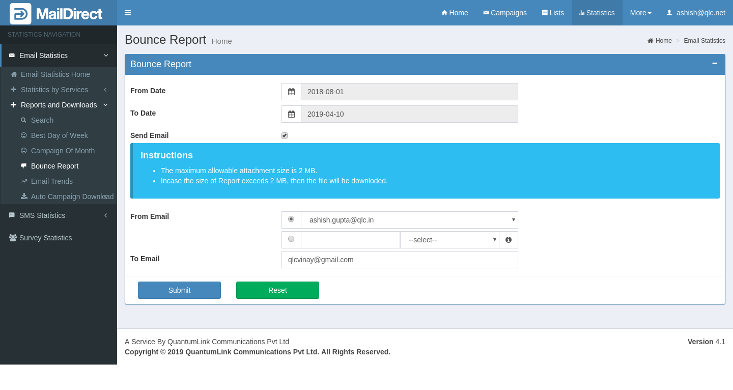 If user selects from date and to date, and click on submit button, MailDirect displays download Statistics Bounce screen.