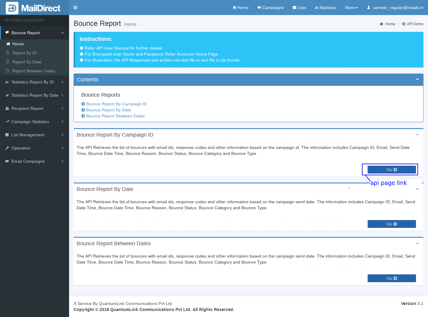 API DemoBounce Report Bounce Report Home Bounce Report Home This page provides the details of the functionality of the API's in Bounce Report Section. Clicking on redirects to Demo section of the corresponding API. Figure : Bounce Reports – Home page