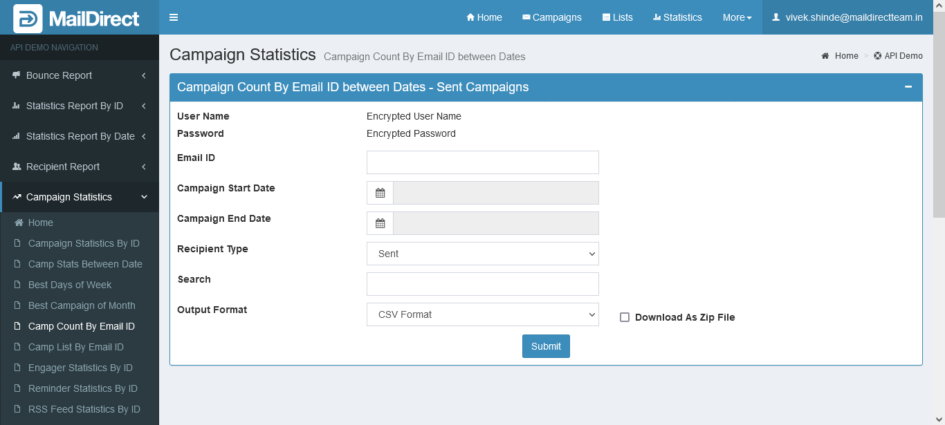 - The API retrieves the count of Email Campaign Statistics based on the EmailId, Start and End Date, Recipient Type (Sent, Viewed, Clicked, and Bounced Recipient), and Search (by campaign id, campaign name, and message description).