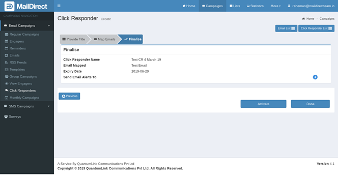 If clicked on active, Click Response is active for send and displays in active tab in click response |