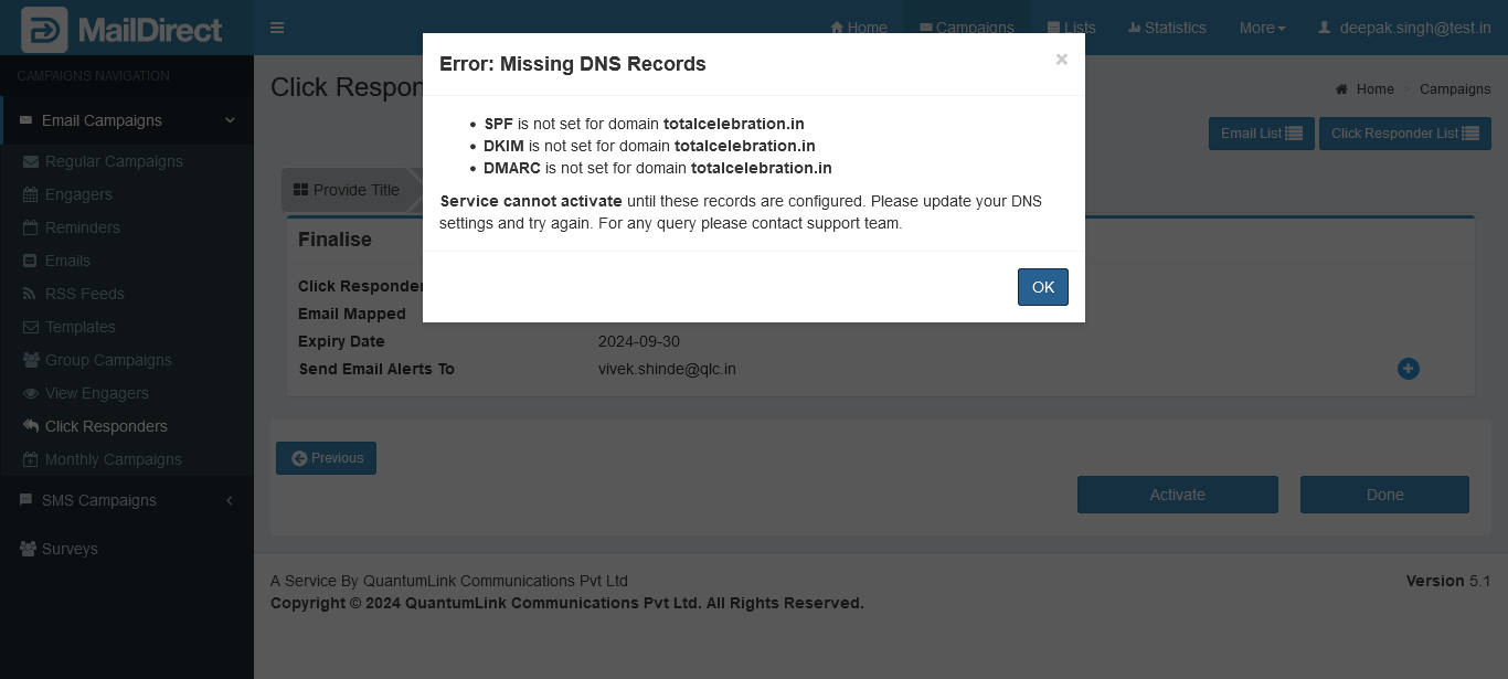 Note: Users who fail to configure DNS records, such as DMARC, SPF, and DKIM, will have an error message pop-up and won't be able to continue until DNS records are configured. At this stage the user is not allow to activate Click Responder when map email with domains that do not have DNS records configured.