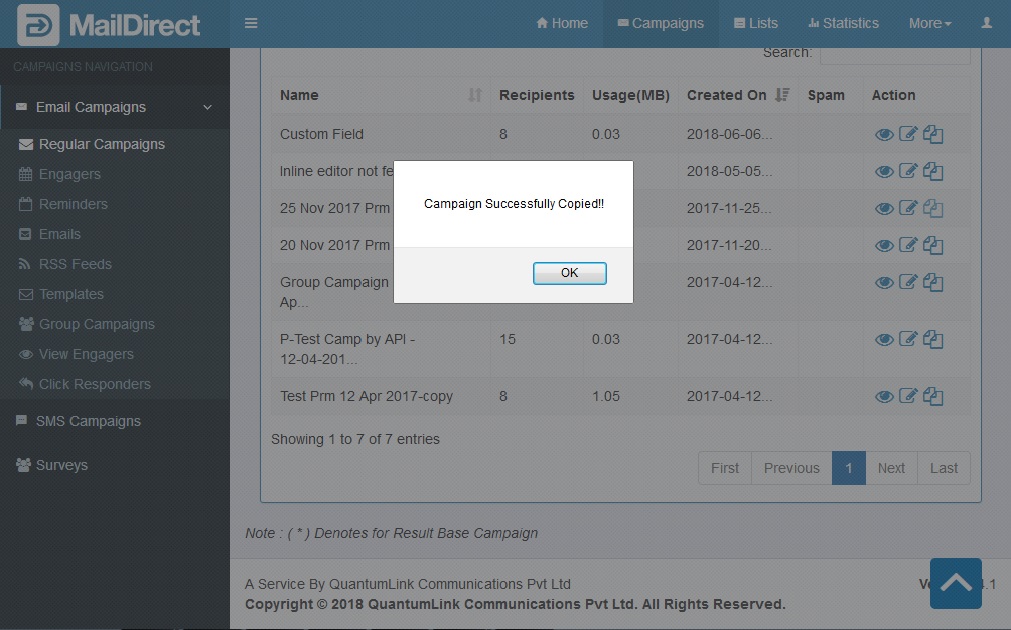 Figure : Campaign List-Copy Campaign successful pop-up