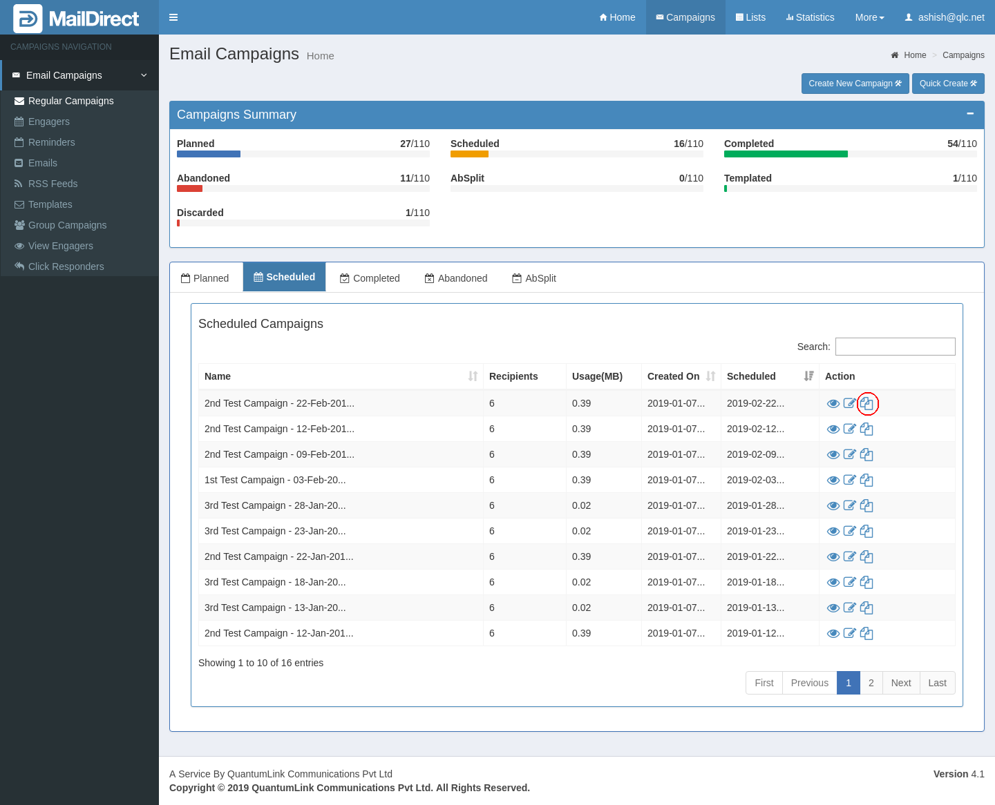 - Click to Copy any campaign from planned email campaign to get a new copy of campaign.