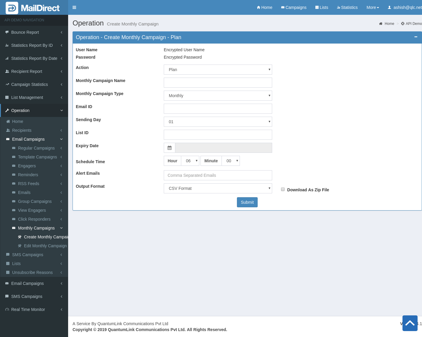 - The Other parameters includes Monthly Campaign Name, Email ID, Lists Ids (Comma separated), Schedule Time, Expiry Date and Alert Email (Comma separated).