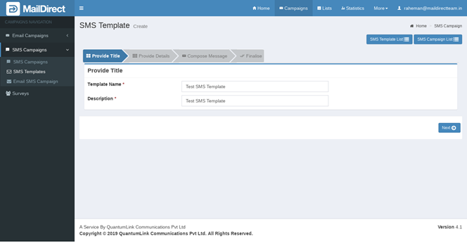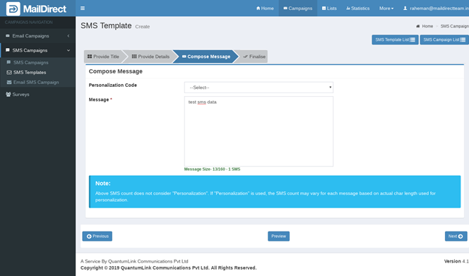 - Mail Direct displays the SMS Template Campaign Wizard Preview screen.
