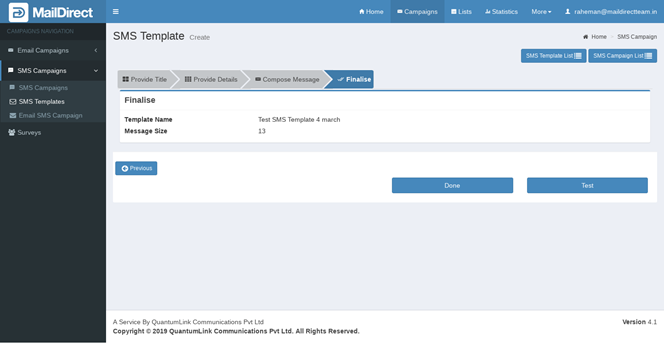 - Mail Direct displays the SMS Template Wizard Finalize screen.