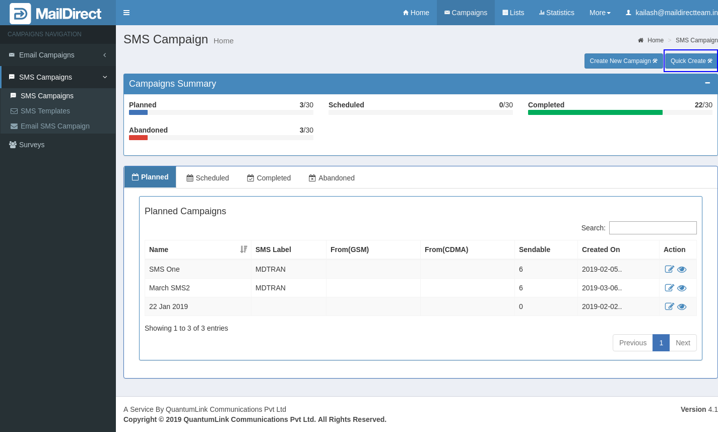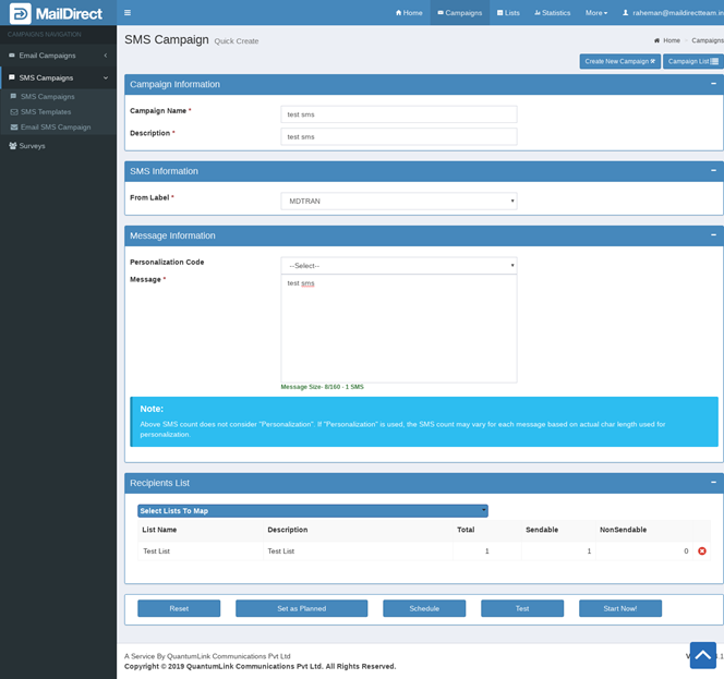 - MailDirect displays the Create New Campaign screen with the campaign added to the Planned SMS Campaigns section.