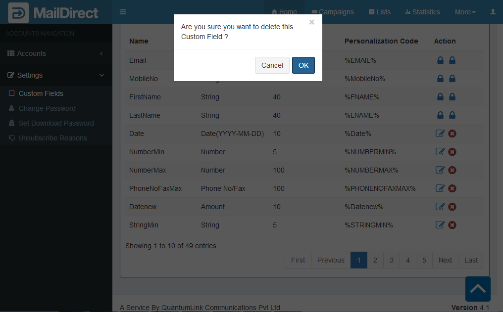 Working with Account ManagerSettingsCustom Field Delete Custom Field Delete Custom Field Click on to delete Custom Field. A Pop Up will appear as: Figure : Delete Custom Field