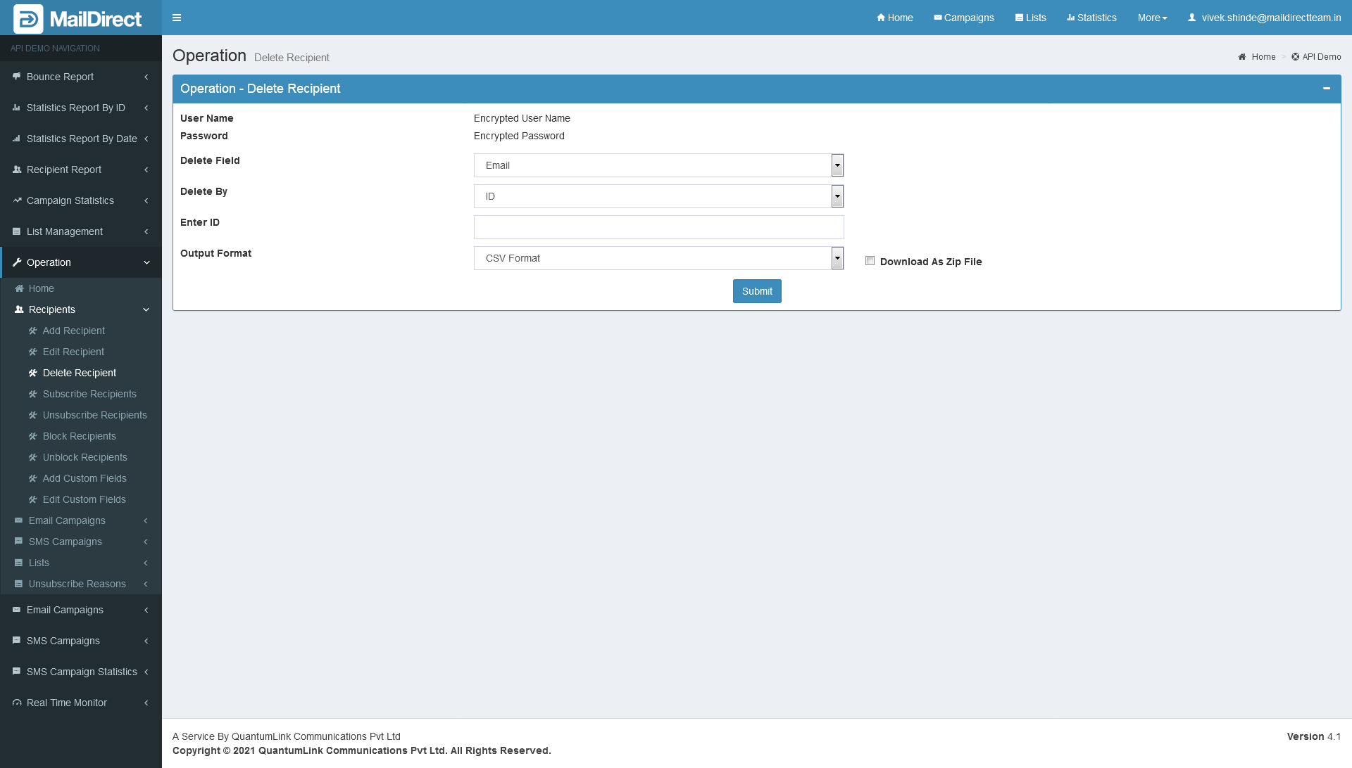 - The API is used to delete recipient based on ID, Email, Mobile and Unique Field.