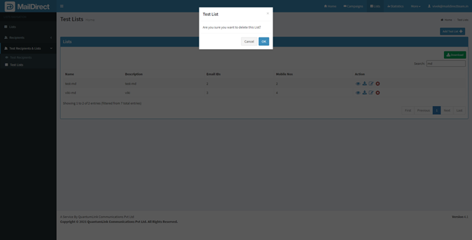 Delete button from action column. - MailDirect will displays confirm box popup with OK and cancel options.