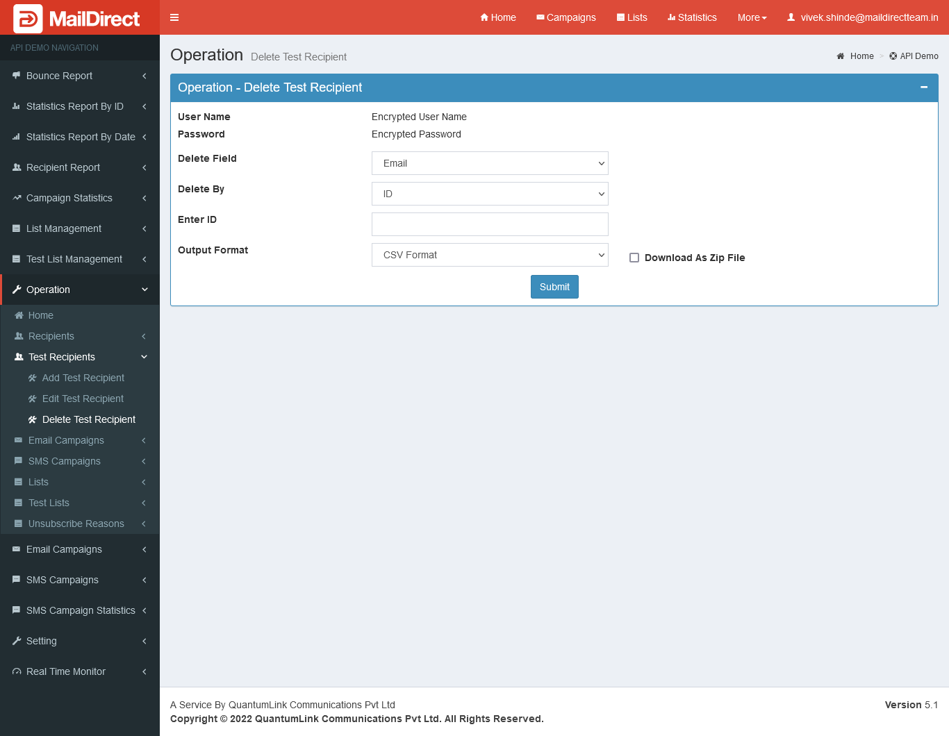 - The API is used to delete test recipient based on ID, Email and Mobile.