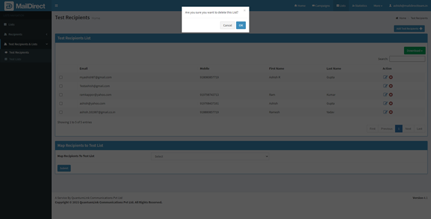 button from Action column to delete test recipient data. - MailDirect displays confirm box to conform weather user want to delete the recipient or not.