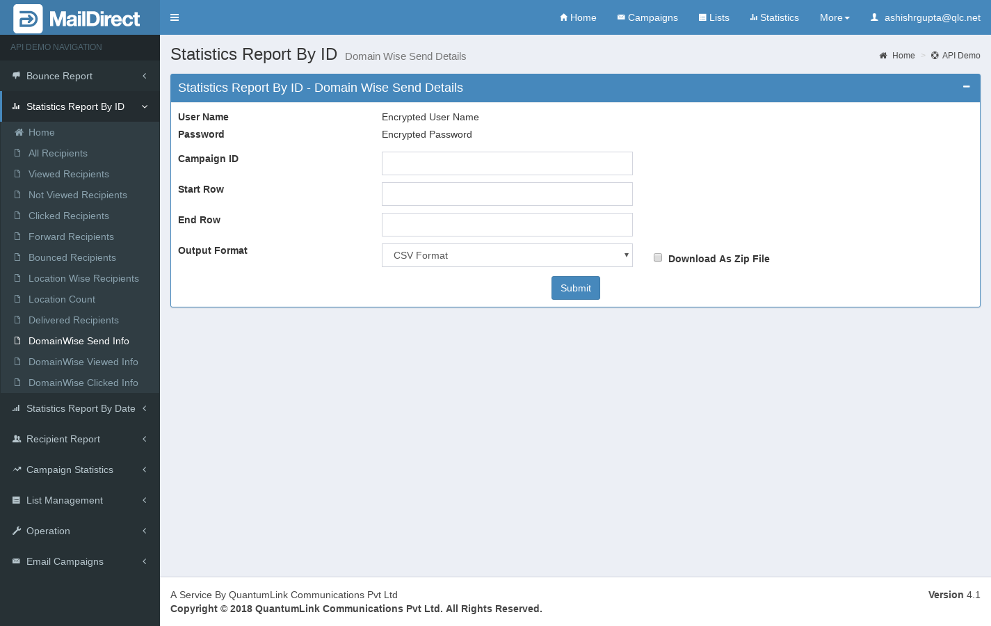 - The API Retrieves the Domain Wise Send Details based on the campaign id.