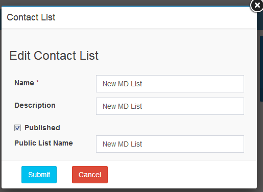 Type /Edit the public name for the list as required. This field is mandatory if the Published check box is enabled. |