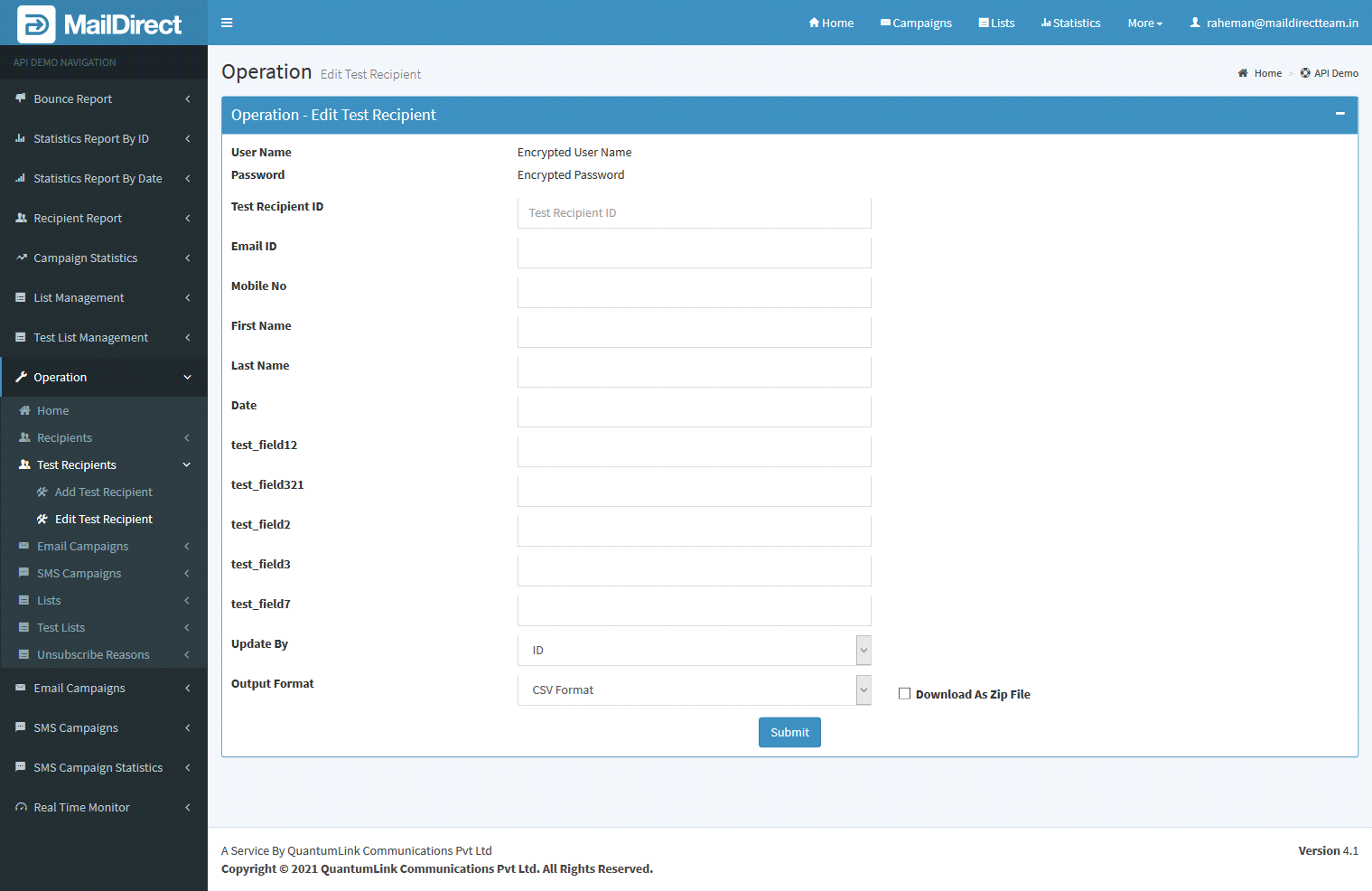The key to update test recipient on the basis of ID, Email and Mobile. |