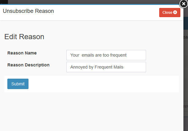 Click on for the Unsubscribe Reason row to Edit Unsubscribe Reason. Edit Unsubscribe Reason Form will appear as: