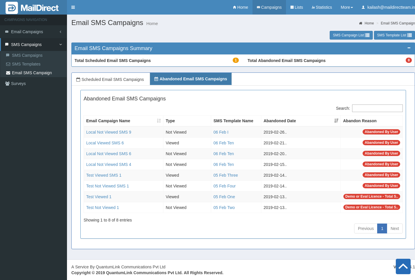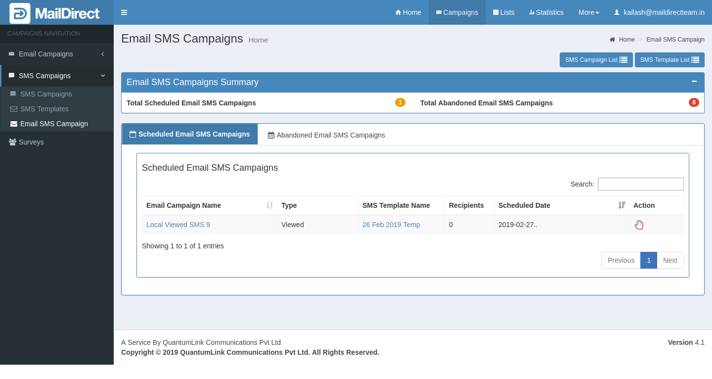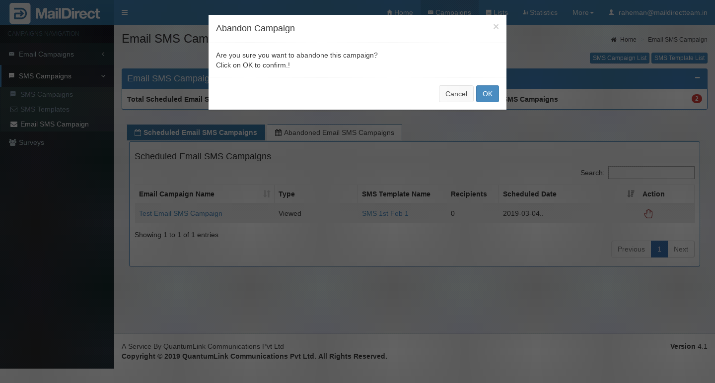 The list of Scheduled and Abandoned Email SMS Campaigns are provided in Tabs, with individual row.