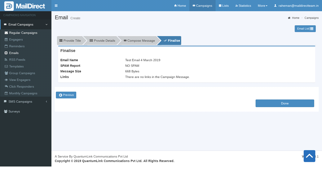 Displays links and Google Analytics option in created Message. Refer Enable and Disable Google Analytics |