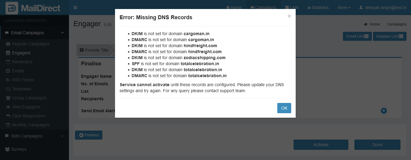 Note: Users who fail to configure DNS records, such as DMARC, SPF, and DKIM, will have an error message pop-up and won't be able to continue until DNS records are configured. At this stage the user is not allow to activate Engager when map emails with domains that do not have DNS records configured.