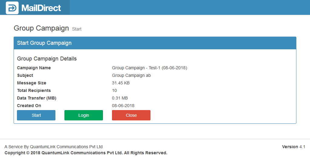 Working with Campaign ManagerManage Group Campaign Group Campaign Activation Page Group Campaign Activation Page Figure : Group Email Activation Page The User has the option To Start Group Campaign, To Login or To Close the Window.