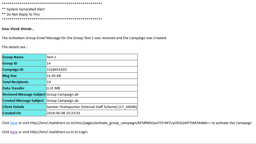 On Successful Group Campaign the sender will receive an Email to Activate Group Campaign. The sample is: