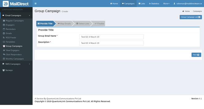 - Mail Direct displays the Group Campaign Wizard Provide Detail screen.