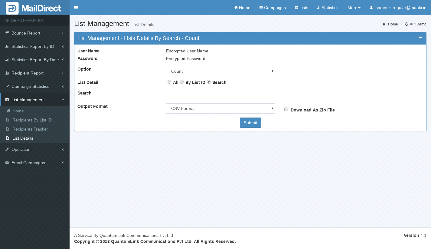 - The API retrieves the count of list details by Search (By List Name and List Description). The count fetches the ListCount of List Details by Search.