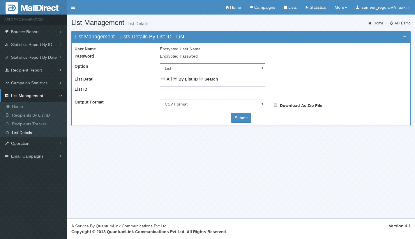 - The API retrieves the list of list details By List ID. The Details includes ID, ListName, Description, ListType, TotalEmails, BlockedEmails, UnsubscribedEmailsbyAdmin, UnsubscribedEmailsbyUser, NotOptedIn, SendableEmails, NotSendableEmails, TotalMobileNos, BlockedMobileNos, SendableSms, NotSendableSms and UnsubscribedMobileNos.