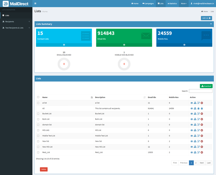 On the List Manager menu, click the List option from top menu. MailDirect displays the Manage Lists screen. The lists are mapped to campaigns and thus define the recipients for the Email and Sms Campaign.