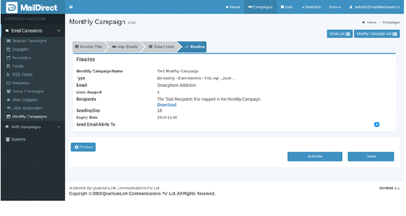 If clicked on active, Monthly Campaign is active to send Monthly Campaign for the selected sending day of Month and displays in active tab in Monthly Campaign |