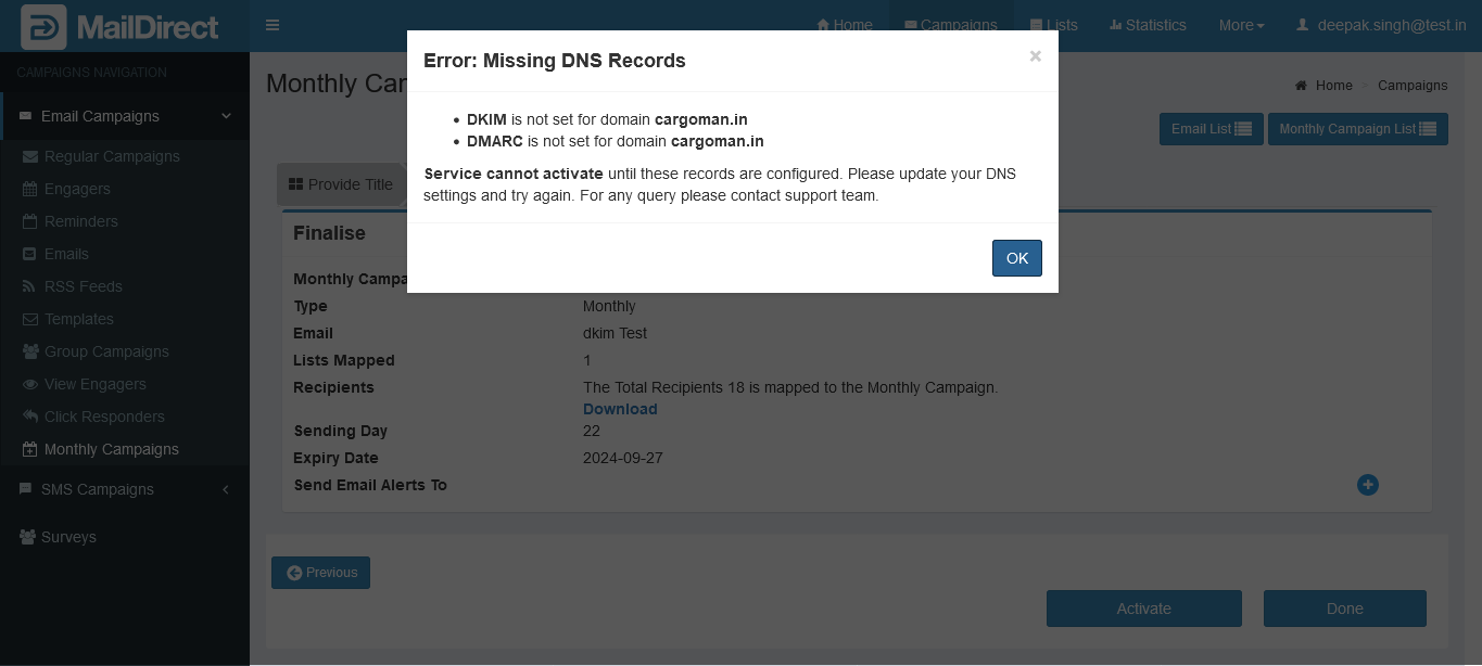 Note: Users who fail to configure DNS records, such as DMARC, SPF, and DKIM, will have an error message popup and won't be able to continue until DNS records are configured. At this stage the user is not allow to activate Monthly Campaign when map email with domains that do not have DNS records configured.