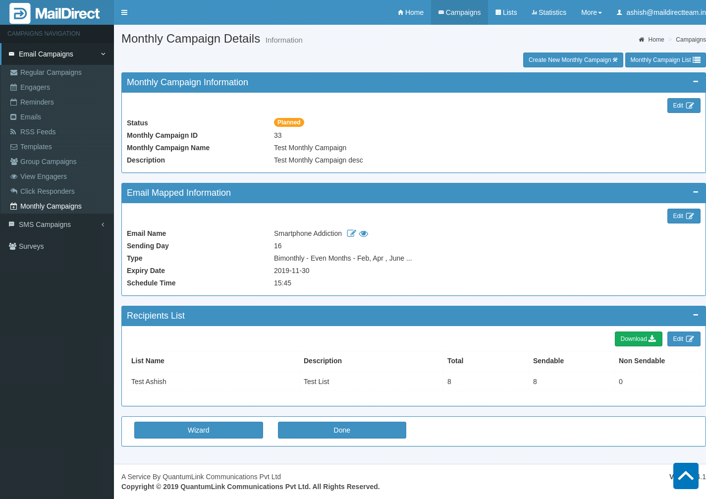 This section displays information regarding list mapped to Monthly campaign. List Details includes List Name, Description, total recipients, sendable recipients and non sendable. Download recipient with/without Custom field. When click on edit button it will displays wizard page where user can edit list mapped information.
