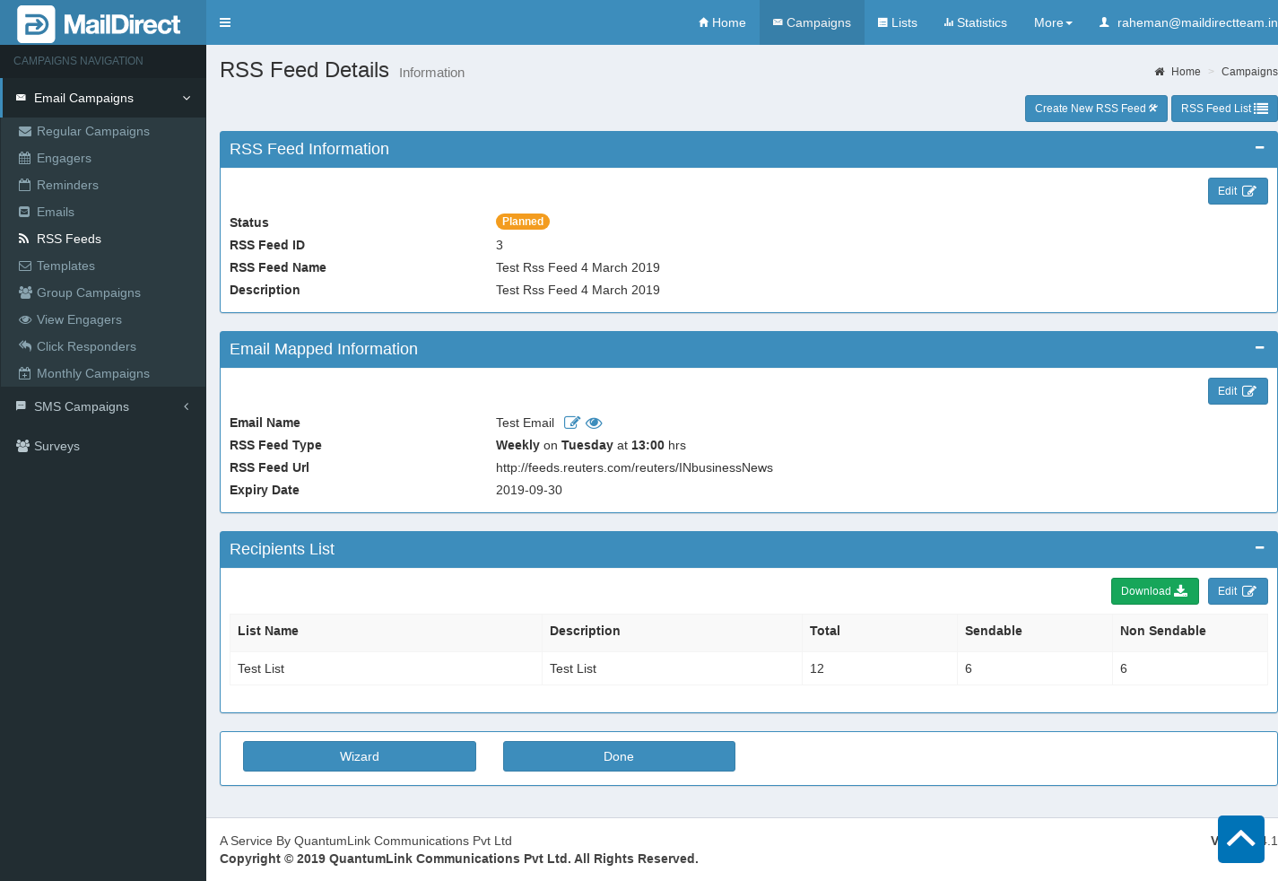 This section displays information regarding list mapped to RSS Feed. List Details includes List Name,Description,total recipients, sendable recipients and non sendable. Download recipient with/without Custom field. When click on edit button it will displays wizard page where user can edit list mapped information.