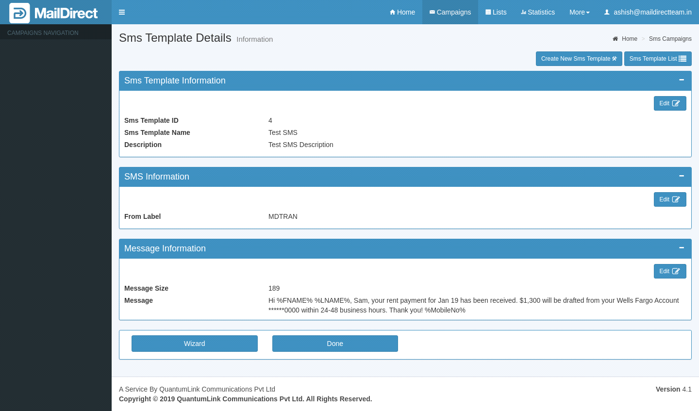 at SMS Template Home Page to view SMS Template details. - Mail Direct displays the Details screen.